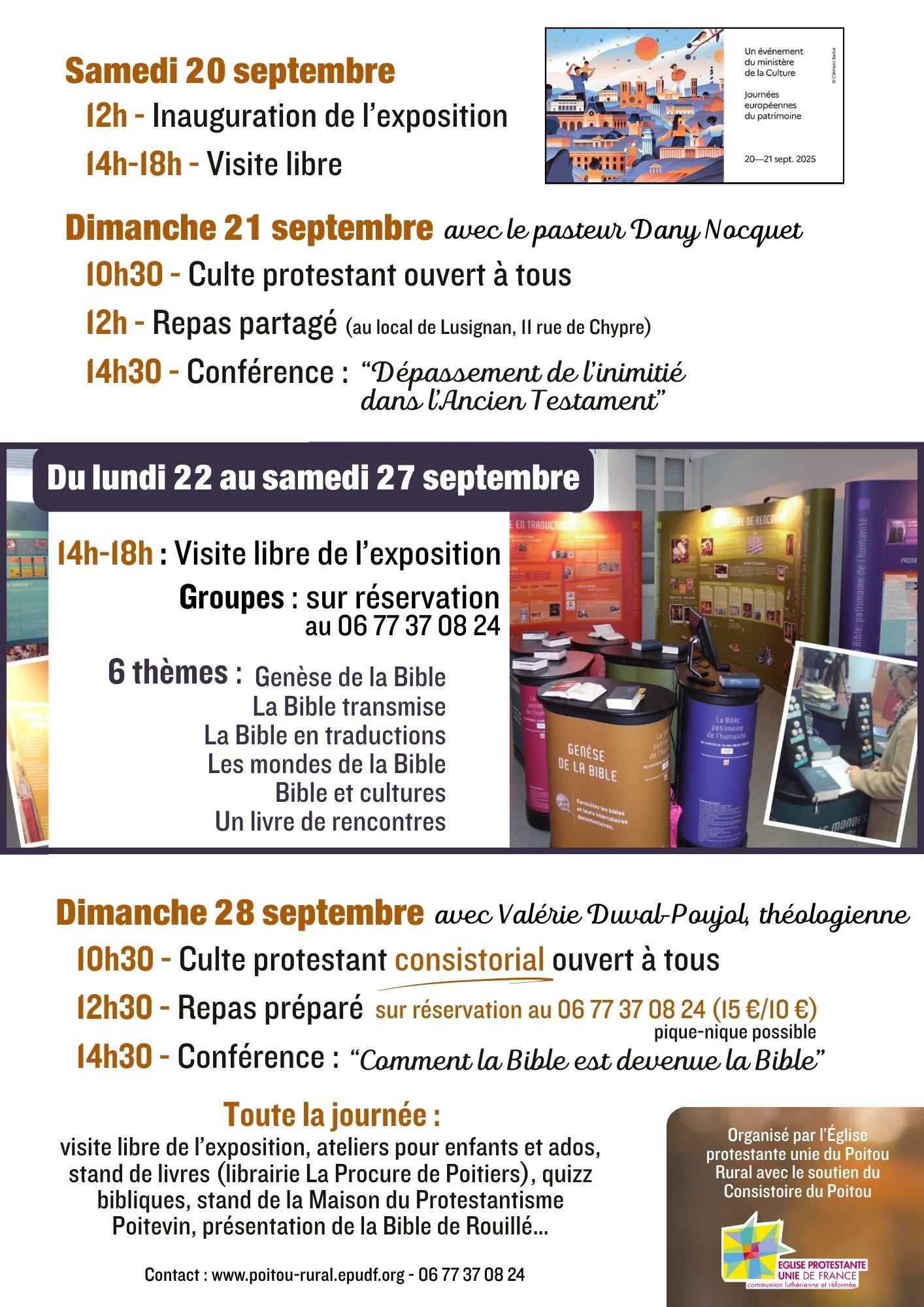 Toute la journée du 28, visite libre de l’exposition, ateliers pour enfants et ados,stand de livres (librairie La Procure de Poitiers), quiz bibliques, stand de la Maison du Protestantisme Poitevin, présentation de la Bible de Rouillé…