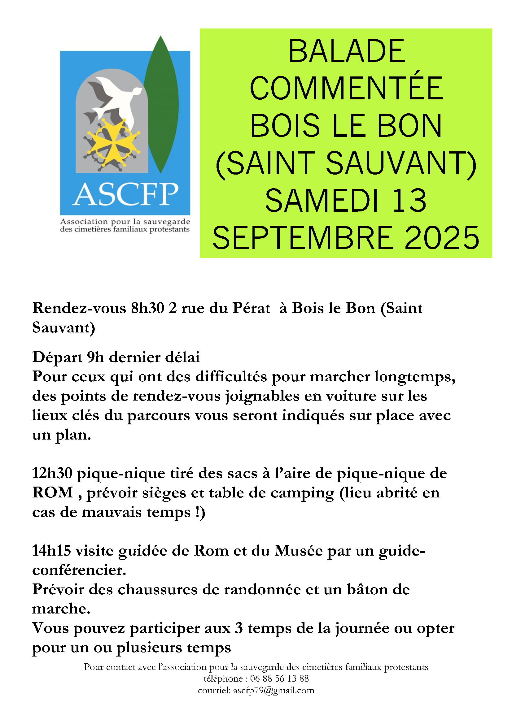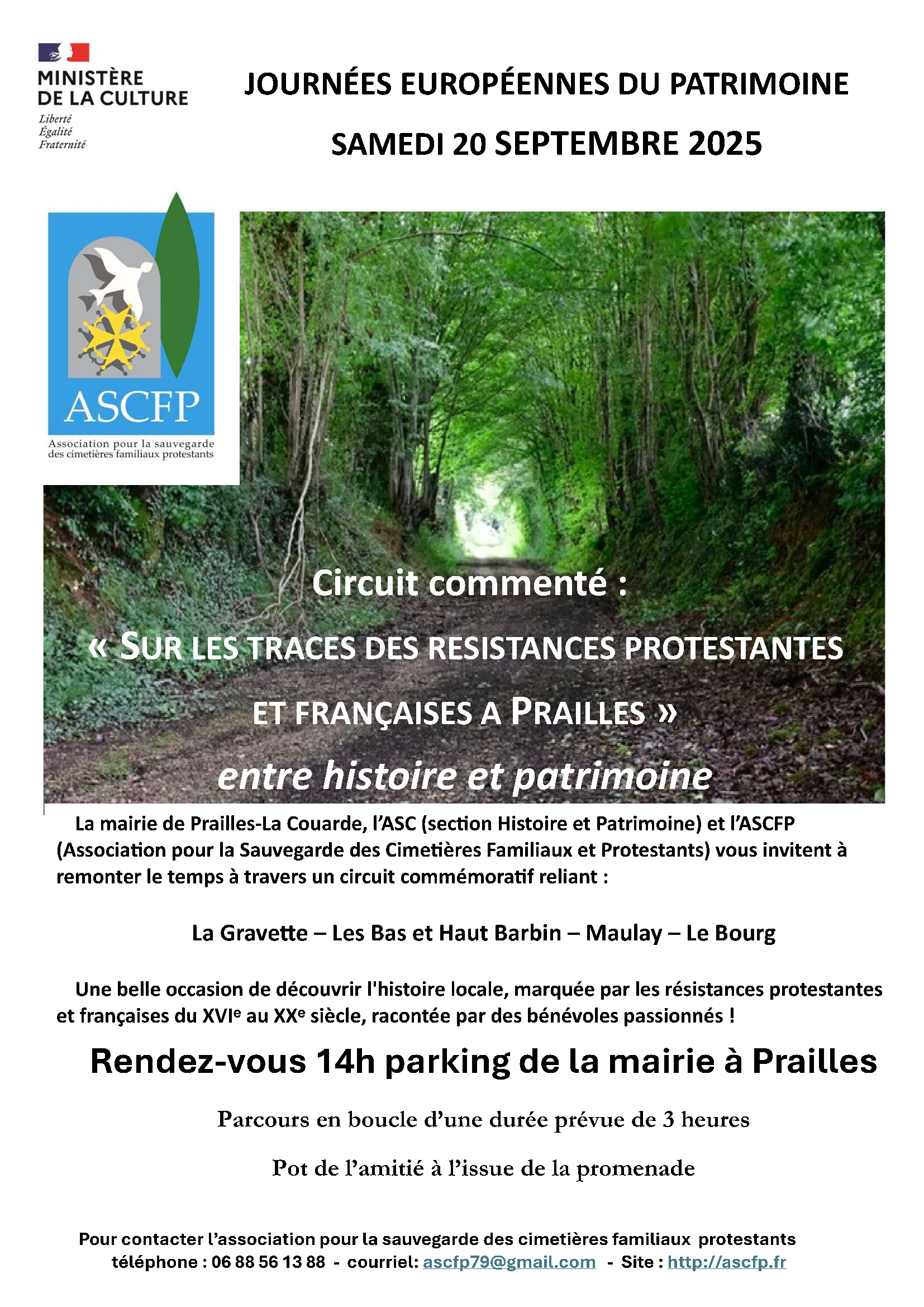 Et pour finir pour ce mois de Septembre, dans le cadre des journées européennes du patrimoine le 20 septembre, vos pas vous conduiront sur les traces des résistances huguenotes et françaises à Prailles.