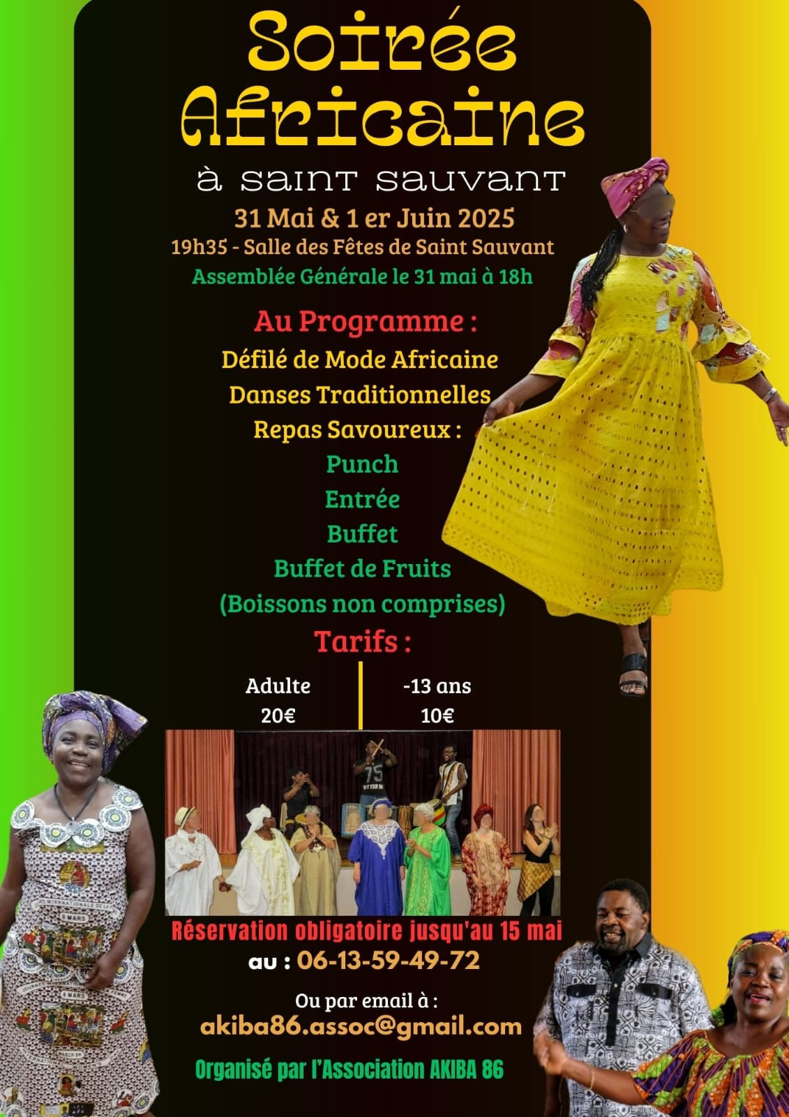 Samedi 31 mai à la salle des fêtes de Saint-Sauvant à partir de 19h30 (et dimanche 01 juin après le culte), Soirée africaine avec repas, défilé de mode, danse africaine. Organisé par l'association Akiba 86 au profit des jeunes filles camerounaises. I Tarif 20€ pour les adultes, 10 € pour les -13 ans.