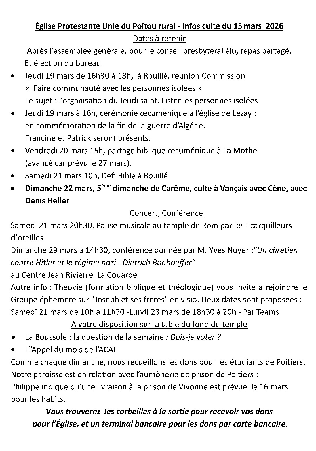 Infos Culte du 15 mars 2026 Temple de Lezay. Culte célébré par Patrick Rolland dans le cadre de l’assemblée générale de notre église.