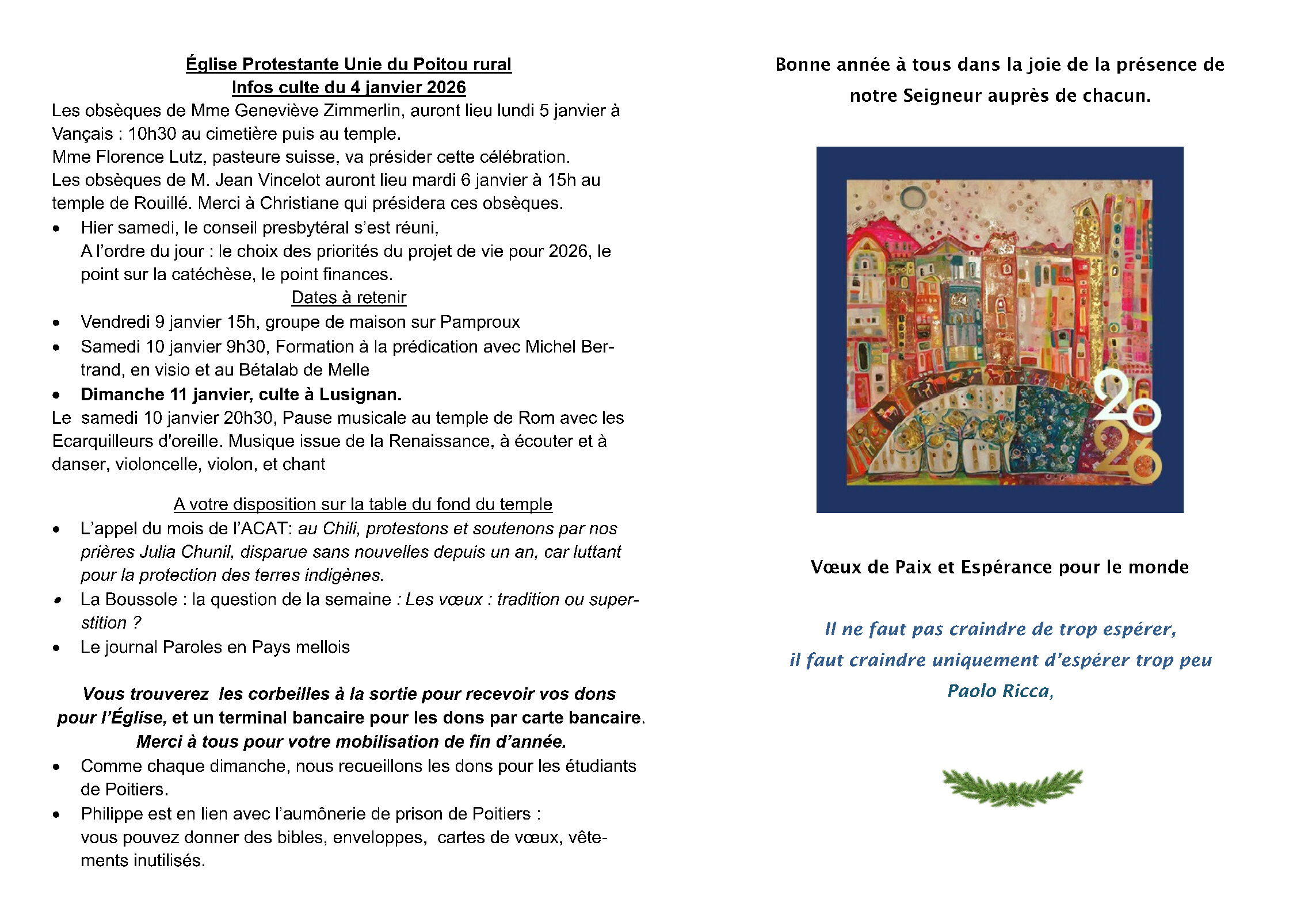 Chaque semaine, retrouvez l'essentiel des informations de la vie de l'Eglise partagées lors du culte en cliquant ici.