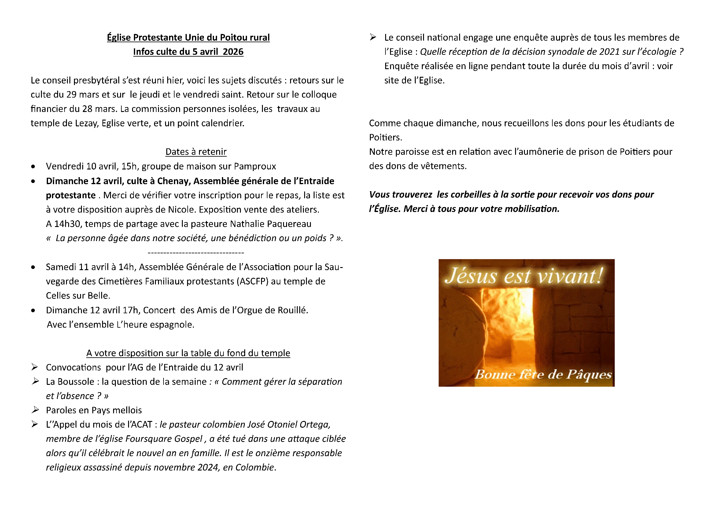 Infos Culte du 5 avril 2026 Temple de La Mothe St Heray. Culte célébré par Roland Poupin.