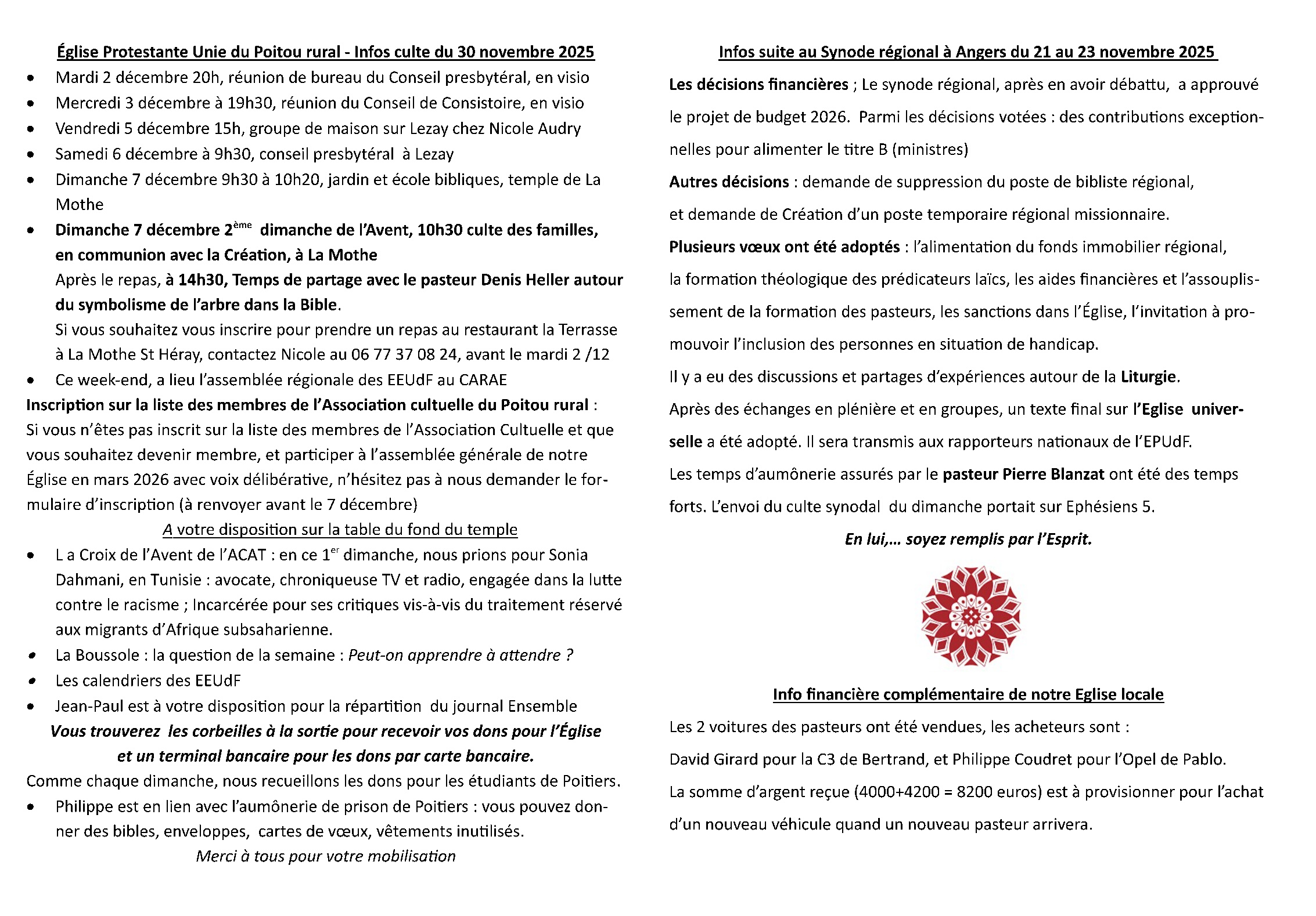 Infos Culte du 30 novembre 2025
