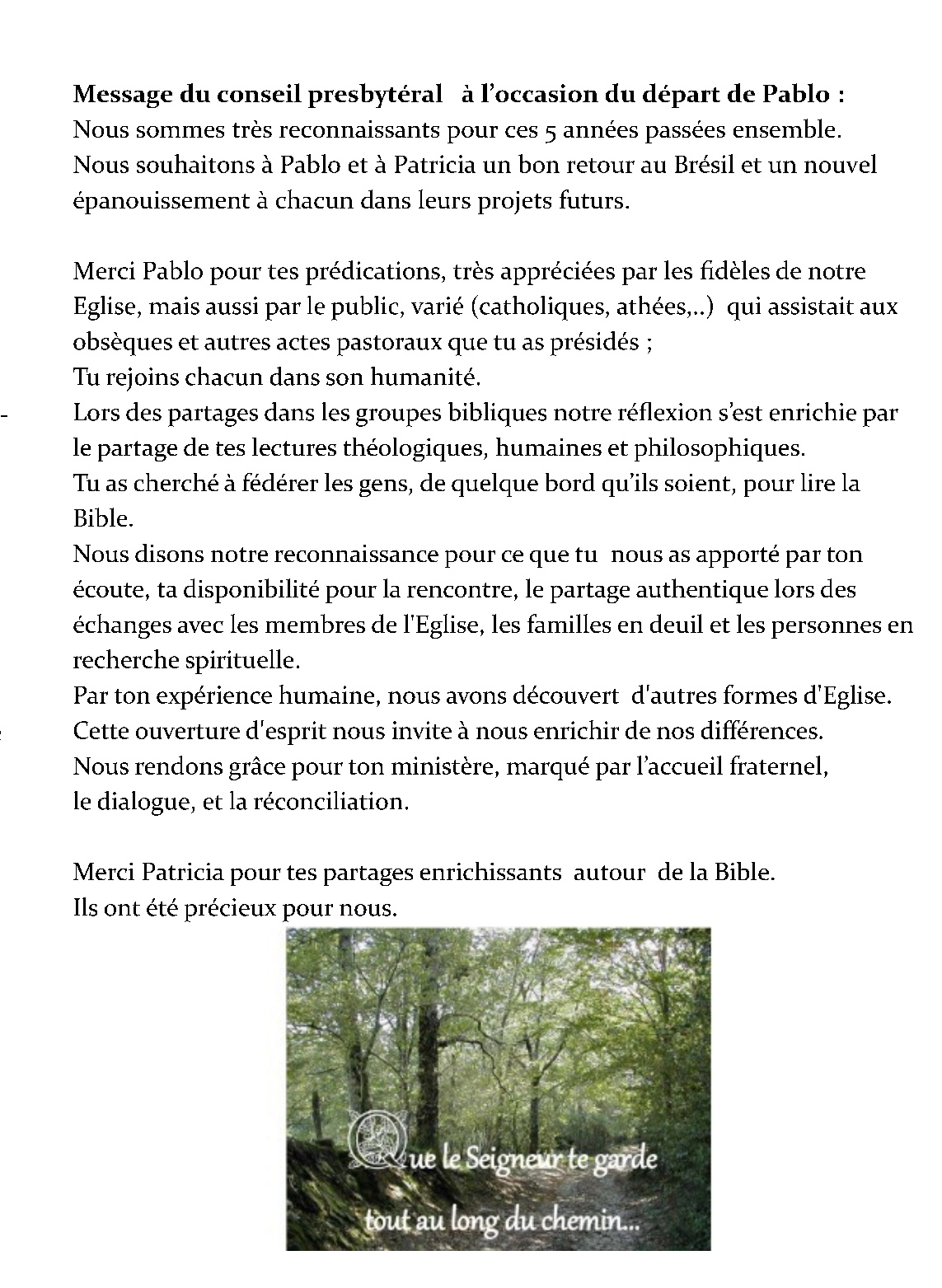 Pablo a fait son culte de départ pour son pays natal , le Brésil, ce dimanche 17 aout au temple de Rouillé avec une présence importante de tous les paroissiens qui sont venus leur donner , à lui et à Patricia , un hommage pour tout ce qu’il a donné à notre paroisse , et à celles qu’il a eu , qu’ils ont eu l’occasion de côtoyer.