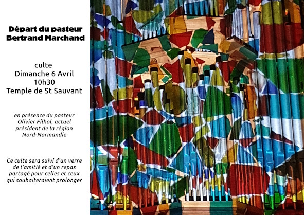 Dimanche 6 avril à 10h30 au temple de Saint-Sauvant, culte en présence du pasteur Olivier Filhol, actuel président de la Région Nord-Normandie, à l'occasion du départ du pasteur Bertrand Marchand. Ce culte sera suivi d'un verre de l'amitié et d'un repas partagé pour celles et ceux qui souhaiteraient prolonger.