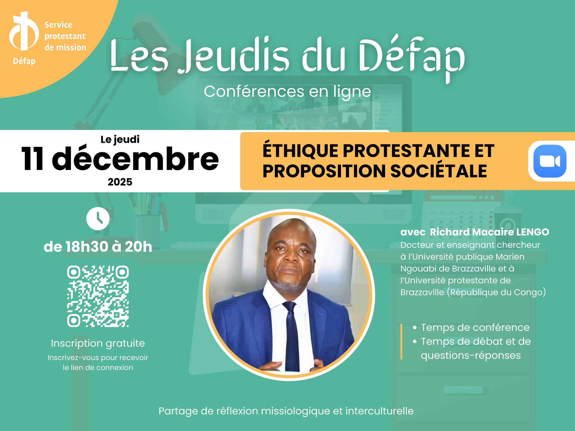 Retrouvez Richard Macaire Lengo, docteur et enseignant chercheur à l’Université publique Marien Ngouabi de Brazzaville et à l’Université protestante de Brazzaville (en République du Congo), le jeudi 11 décembre 2025, à 18h30 (GMT+1). Pour vous connecter, suivez ce lien Attention, vous êtes connectés depuis différents pays, veuillez vérifier vos correspondances horaires pour ne pas manquer la conférence.